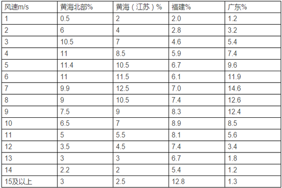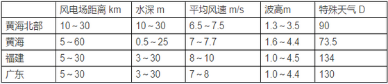 影响运维船主要参数的环境因素主要包括,距离,水深,波高,风况等等。一般而言抗风能力超过抗浪能力,所以波高是更关键的因素。国内风电场主要集中在黄海北部,渤海湾,黄海,福建和广东等区域。各区域环境情况(见表1、表2)。