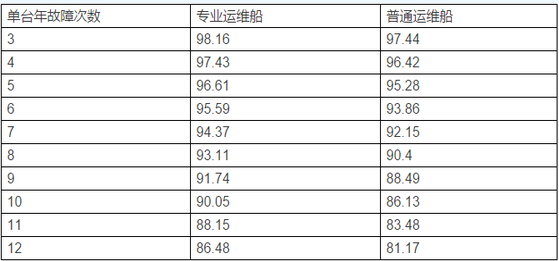 从表3可以看出,机组单台年故障次数超过5次时采用普通运维船可利用率小于95%;如果采用专业运维船,单台年故障次数为5次时可利用率超过96%,当机组单台年故障次数3次,可利用率可以达到98%。