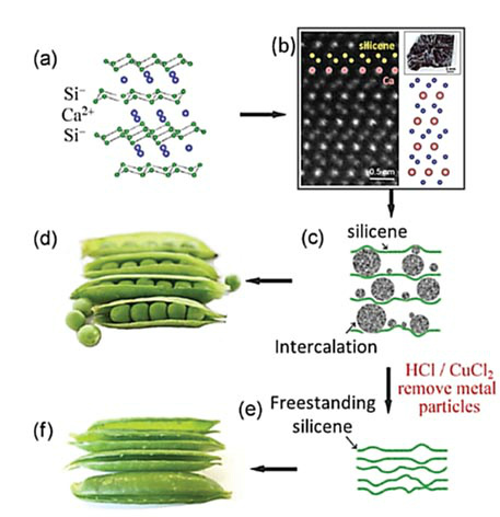 另外,利用固相法制备的硅烯中硅原子和钙原子交替排列形成层状结构,通过局部化学插层的方法把钙移除,进而得到独立无衬底的硅烯。利用这种化学法制备的硅烯作为锂电池的阴极,同时具有硅基材料的高容量和石墨材料的良好循环特性等优点,成为一种非常有潜力的锂离子电池负极材料。