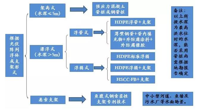 根据以往设计经验,在最高洪水位时的水深小于5m的水域、稳沉区且无防渗层的水面,可建设架高式水面光伏电站;非稳沉区水域或在最高洪水位时的水深大于5m的水域,可建设漂浮式水面光伏电站;对于中小河流、小型养殖水塘、污水处理厂等场地,可选用能够实现较大跨度的鱼腹式悬索支架形式的光伏电站。