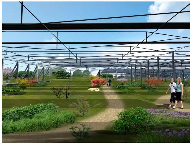 环境友好、美观、和谐、更加艺术:鱼腹式钢索技术多用于机场、高铁站等大型公共建筑外墙的幕墙上,将该技术应用于光伏电站为国内首创。鱼腹式钢索支架优美的建筑结构形式,使光伏电站更具空间感,更加环境友好、更加美观、更加和谐、更加艺术。