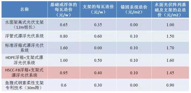 上面对各种水面电站建设形式的适用范围、优点、缺点等进行了简要分析,不同的系统形式适用不同的建设场景,对于同一个光伏项目的不同区域,也会存在不同的设计方案,需要设计院根据实际的条件,经过技术经济比选确定合理的设计方案。下面简要比较一下各种水面光伏电站基础(浮箱)支架系统的造价。