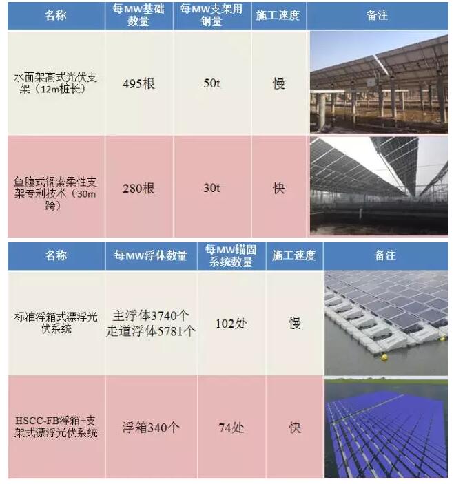 以水面架高式光伏支架与鱼腹式悬索柔性支架;标准浮箱式漂浮光伏系统与HSCC-FB浮箱+支架式漂浮光伏系统为例,比较其施工工期特点。