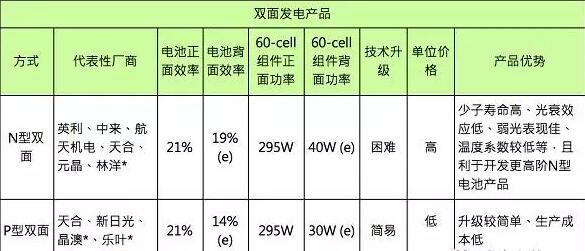 此外,今年展场中也同时观察到一项新产品崛起:P型PERC双面技术。它标榜是在现有PERC制造过程中进行升级与改良,甚至有机会不需添加额外设备即可实现双面发电的效果。这种快速升级的方式已有制造商不约而同投入,尤其以高效单晶产品出货为主的厂商,如天合、新日光、晶澳、乐叶等。搭配双玻封装技术,瓦数将可拉近与N型双面产品的距离,或许会成为今年PERC衍生发展的重要方法(参见下表)。