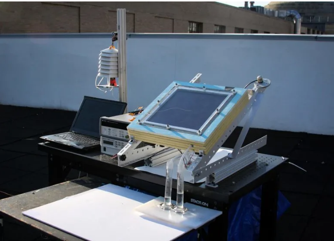 早期的设备证明了小王和她的同事们提供了一个概念验证的系统,就是利用设备内的温差让一种吸附剂材料——收集液体表面画在空气中的水分第二天晚上和释放它。当材料被阳光加热时,被加热的顶部和被遮蔽的底部之间的温差使得水从吸附剂材料中释放出来。然后水在收集板上凝结。