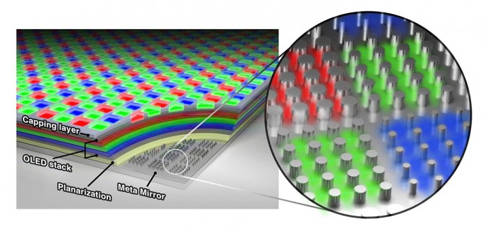 太阳能电池板和新的OLED的关键创新是一个带有纳米级反射金属基底层,称为光学元表面。该表面可以操纵光的反射特性,使不同的颜色在像素中产生共振。使用基底层波纹的新设计使得每个像素的高度相同,这使得大规模和微观规模的制造过程更加简单。