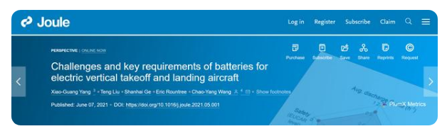 研究人员定义了飞行汽车电池的技术要求,并于2021年6月7日在知名科学期刊《焦耳》(Joule)杂志报告了一个原型电池。