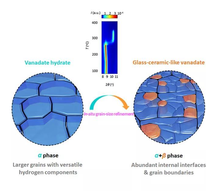 与传统自下而上合成纳米-微米材料的方法(如喷雾造粒、共沉淀自组装等)不同,该研究采用了一种自上而下的微米-纳米材料合成策略——首先合成微米级钒酸盐前驱体,再通过低温相转变过程引入类玻璃-陶瓷相中间态,同时晶粒发生细化,从而得到微米级致密纳米晶电极材料(如图1所示)。这种具有类玻璃-陶瓷相的钒酸盐电极材料不仅具有丰富的晶界/相界面,以保证锂离子的快速传输,同时具有较小的比表面积,以减少与电解液之间的表面副反应。基于上述优势,该钒酸盐正极材料表现出优异的大倍率、高容量和长循环的电化学性能。这一合成策略对其他前驱体为水合物的过渡金属氧化物电极材料同样具有普适性,也为储能材料中的微米-纳米结构设计提供新思路。