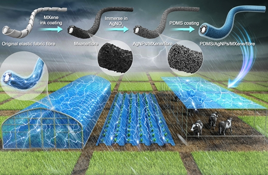 该聚合物能够防水并与环境中的雨水发生电子转移。而碳化钛感应电极,不仅具有高导电性能,还因其高电负性可以助力表面聚合物抢夺电子。因此在实现农用纺织品原有的农用保护材料、保温、遮阳、水土保持、排水灌溉、种子培育基材的功能基础上,还能从农业环境中源源不断地获取能源,为智慧农业提供驱动力,实现农业信息“无源实时感知”。