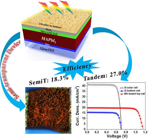 该团队使用真空热蒸发沉积薄膜的方法,以三氧化钼/金纳米网/三氧化钼“三明治结构”作为透明电极,替换掉传统钙钛矿电池中的金属背电极。制备的半透明钙钛矿太阳能电池具有18.3%的光电转化效率,这是目前使用超薄金属制备的半透明钙钛矿电池的最高效率之一。将此半透明钙钛矿太阳能电池与光电转化效率23.3%的硅异质结薄膜电池结合,得到了光电转换效率27.0%的四端叠层太阳能电池。