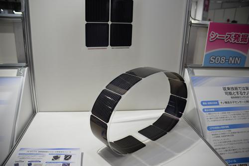 松下公司开发的柔软超轻晶体硅太阳能电池模块,在太阳能电池模块表面结构上用树脂或胶片替换玻璃基板,成功减轻了重量。在每两年举行一次的横贯澳大利亚大陆的世界太阳能车挑战赛上,2017年日本队的参赛车辆使用了松下公司的这种高效率太阳能电池模块。该模块单位重量输出从13W/kg提高到145W/kg。图为松下公司展示的柔软超轻型太阳能模块。