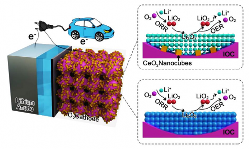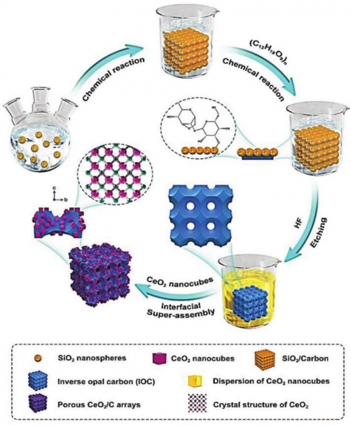 在各种储能和转换技术中,可充电锂氧气电池以其优异的理论能量密度而引起了广泛关注,其理论能量密度是传统锂离子电池的近十倍,非常有希望应用于商业化的电化学储能设备,从而缓解能源危机和减少环境污染等问题。然而,锂空气电池仍然面临很多的挑战,包括低于预期的比容量、相当高的过电势和缺乏循环稳定性等。这也就意味着,引入具有合理结构的正极催化剂材料来促进锂空气电池缓慢的电极动力学过程是十分迫切的。常用的高效催化剂有贵金属及合金、过渡金属氧化物、钙钛矿和金属氮化物、碳化物等。其中,过渡金属氧化物具有成本低、易合成、储量丰富以及催化活性高等优点,已被广泛用作锂氧气电池的正极材料。而氧化铈(CeO2)是一种由面心立方晶胞组成的方萤石结构,具有良好的结构稳定性和优异的催化活性。它的电子排布比较独特,在催化过程中,Ce3+和Ce4+之间容易相互转化,可以保证充放电反应的持续快速发生。另外,CeO2的结构中存在氧空位缺陷,可以在锂氧气电池放电反应中达到氧气泵的效果,将其用作锂氧气电池催化剂从而实现其电化学性能的大幅提升是十分具有发展前景的。因此,利用超组装合成策略把精准控制的氧化铈纳米晶体与多维多尺度的框架结构相结合,可以实现智能化锂氧气电池的新突破。