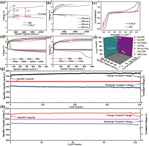 (a)在电流为100 mA/g时,超组装CeO2/C材料和IOC的比容量性能