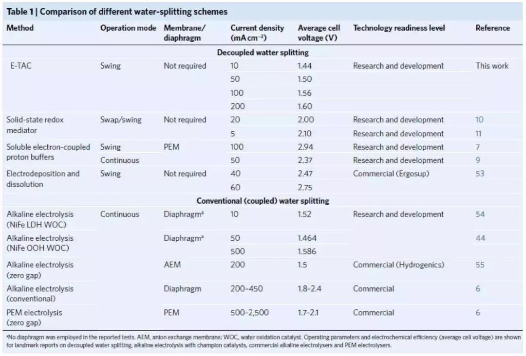在传统的水电解过程中,水的氧化和还原反应同时在电池中的阳极和阴极发生,其能源转换效率仅有75%。以色列理工大学的研究人员通过E-TAC水分解技术可以解耦上述过程,并以98.7%的能量效率显著提升氢气的生产效率。此外,E-TAC不需要昂贵的稀有金属,制造相对简单,且成本更低。下图比较了E-TAC与目前几种主流的电解水方法: