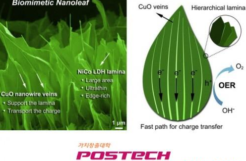 该团队专注于光合作用,通过高效地将水分和营养物质输送到叶脉,并开发出模仿天然叶子优点的纳米叶。它是由“层状双氢氧化物(LDH)”合成的,它模仿了在“CuO纳米线”上引发光合作用的叶体结构,而“CuO纳米线”是模仿叶片静脉输送水分和营养物质的结构。纳米油催化剂利用叶体较大的表面积即LDH板结构促进产氧反应,通过叶丝纳米线快速输送电荷,大大提高了产氧效率。此外,它看起来稳定灵活,因此具有很高的实用价值。
