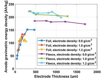 通过将活性材料与超细铜绒相结合,研究人员为电荷载体创建了一个3D供应网络,增强了电导率和锂离子扩散率,从而成功制出了1.2毫米的功能性超厚负极。