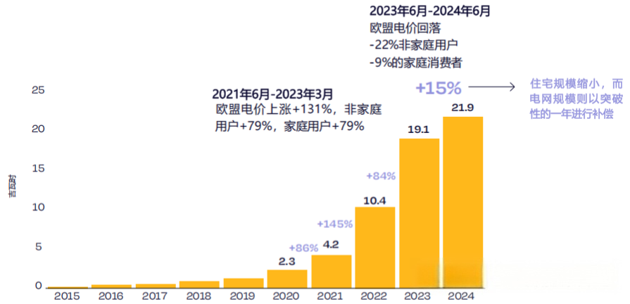 总体情况:欧洲2024年新增21.9GWh电池储能,累计容量达61.1GWh,但年增长率从2023年的84%放缓至15%