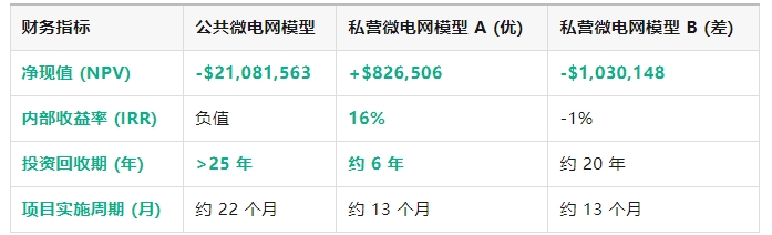 结果显示,在考虑了建设、运营及私营部门合理利润后,私营模式的生命周期成本 (14,028)远低于公共模式(14,028) 远低于公共模式 (14,028)远低于公共模式(22,912)。最终计算出的 “价值增益” (Value for Money) 为正 8,883 美元。这个正值强有力地证明,鼓励私营部门参与微电网建设,比政府直接采购实施更具成本效益。