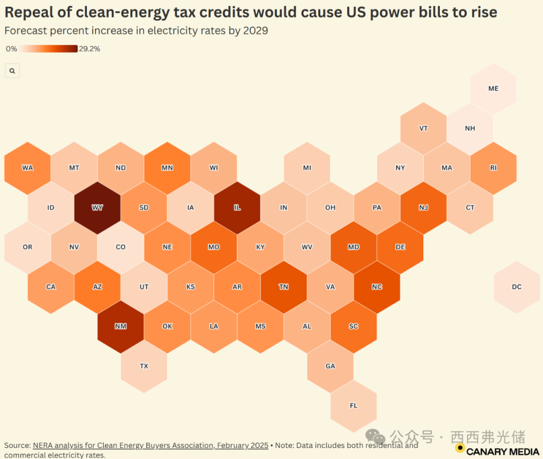 根据清洁能源购买者协会委托NERA进行的分析,取消这些税收抵免将给 各州的公用事业用户带来高昂的成本。到 2029年,受影响最严重的州的电价可能会上涨近30 % 。