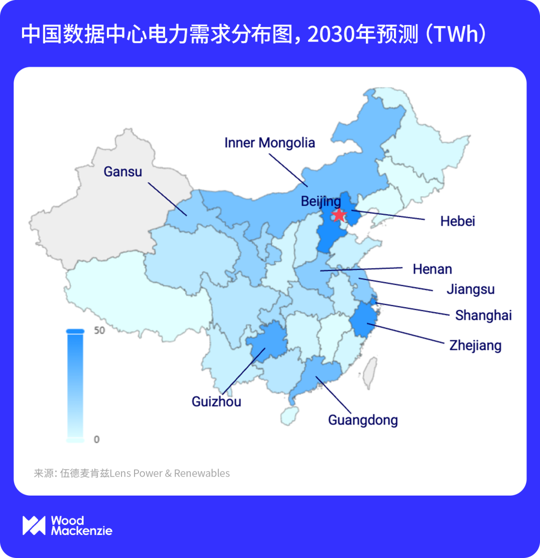 与美国情况类似,中国的数据中心同样集中在特定区域。项目开发和电力需求主要集中在沿海城市,但随着对低成本绿色能源的需求上升,建设正逐步向北部和中部地区扩展。预计到2030年,中国将有20个省份的数据中心电力需求将超过20TWh,其中仅河北、上海和浙江地区的需求总和就将达到1,48TWh,这实际上相当于中国版的PJM市场——即美国以宾夕法尼亚州为中心的电力市场。