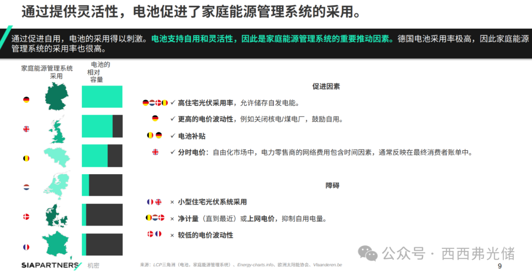 高比例的住宅光伏渗透率(提供可储存的绿电)、波动的电价(创造套利空间)、政府补贴以及分时电价机制是其主要驱动因素。德国在此领域全球领先,其高电池采纳率直接带动了HEMS的普及。反之,净计量电价政策在一定程度上削弱了自我消耗的经济性,从而抑制了储能需求。