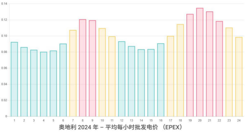 值得关注的是,奥地利的峰⾕电价差约为每千⽡时0.054欧元,深夜(03:00-05:00)的电价最低,约为0.080-0.083欧元/千⽡时;⽽晚间⾼峰(18:00-21:00)的电价则相对较⾼,平均约为0.127欧元/千⽡时,峰值可达0.135欧元/千⽡时(20:00)。这种峰⾕价差为储能系统提供了套利空间,⽤户可以在电价低⾕时充电,在电价⾼峰时放电,从⽽降低⽤电成本。