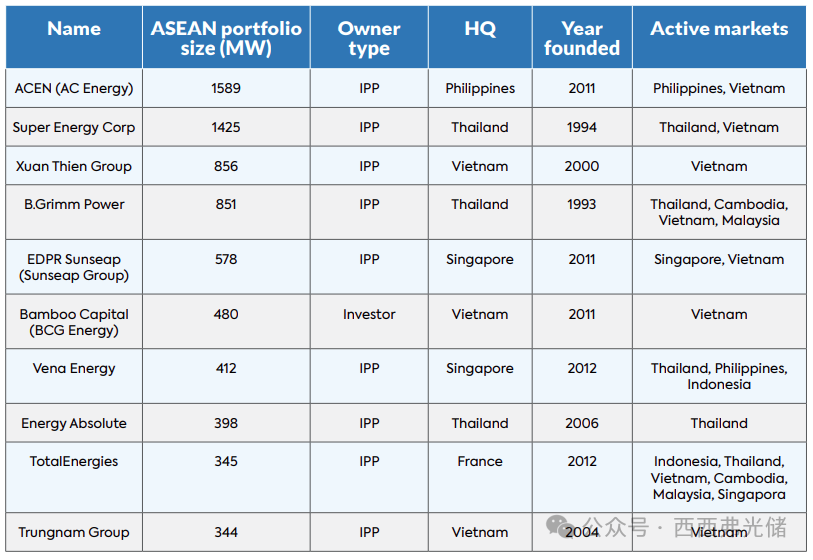 东盟地区的十大太阳能资产所有者合计持有超过7.3吉瓦的运营容量,彰显了领先企业的巨大规模。该市场由垂直整合的独立发电商(IPP)主导,在前十名中占据了九席。