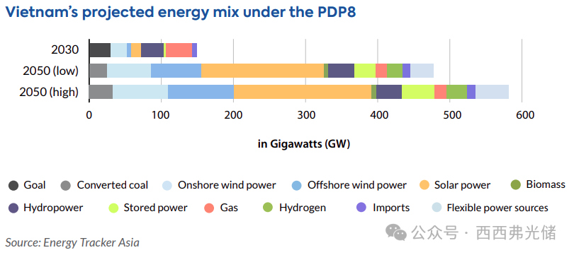 越南以其约19吉瓦的装机容量,遥遥领先,是东盟地区最大的太阳能市场。其快速扩张始于2017年左右,主要得益于吸引私人投资的政策。根据该国更新的第八版电力发展规划(PDP8),越南设定了雄心勃勃的目标:到2030年太阳能装机容量达到20.6吉瓦,到2050年达到惊人的189吉瓦。