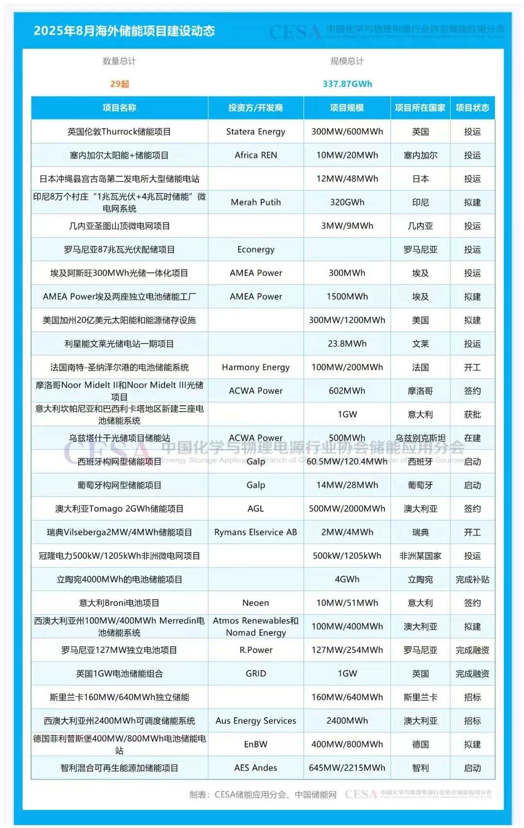 2025年8月,CESA储能应用分会产业数据库追踪到29起海外储能项目建设动态事件,总规模为337.87GWh,涉及Statera Energy、Africa REN、Merah Putih、Econergy、AMEA Power、Harmony Energy、ACWA Power、Galp、AGL、Rymans Elservice AB等全球能源投资方/开发商,建设地点位于英国、塞内加尔、日本、印尼、几内亚、埃及、美国、摩洛哥、乌兹别克斯坦、西班牙、葡萄牙、澳大利亚等国家。