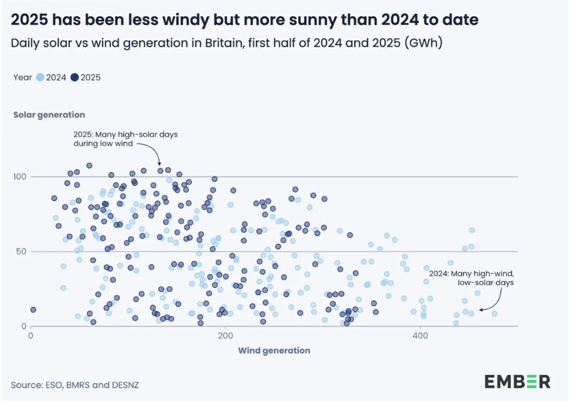 该智库还强调,英国风电与光伏相结合的可再生能源结构有效平衡了该国多变气候带来的能源需求波动。虽然2025年上半年高日照天数显著增加,风电发电量却出现下降——这与2024年初的情况恰好相反。