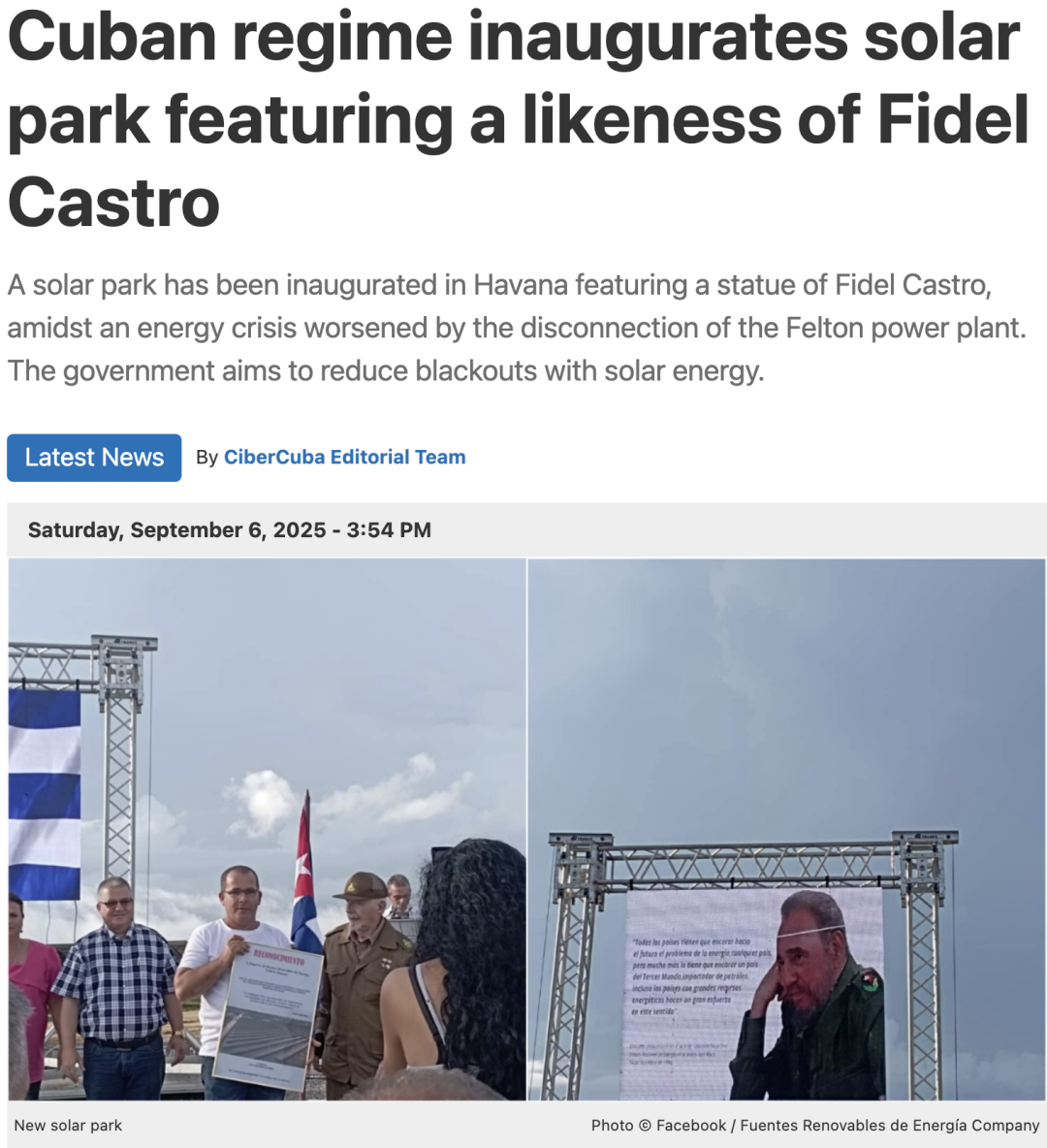 这个21.8兆瓦的太阳能公园竖立着菲德尔·卡斯特罗的雕像,古巴可再生能源公司(EMFRE)在帖子中称卡斯特罗是“这片美丽祖国有史以来最伟大的远见卓识者”。