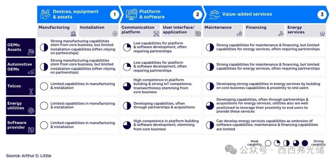 软件供应商越来越有能力在其强大的平台建设和软件开发能力的基础上,提供数字化能源服务。然而,无论是汽车还是其他资产领域的 OEM,其在平台/软件开发和能源服务方面的能力通常有限。通过合作或收购,它们可以更好地帮助终端用户将其灵活性商业化。