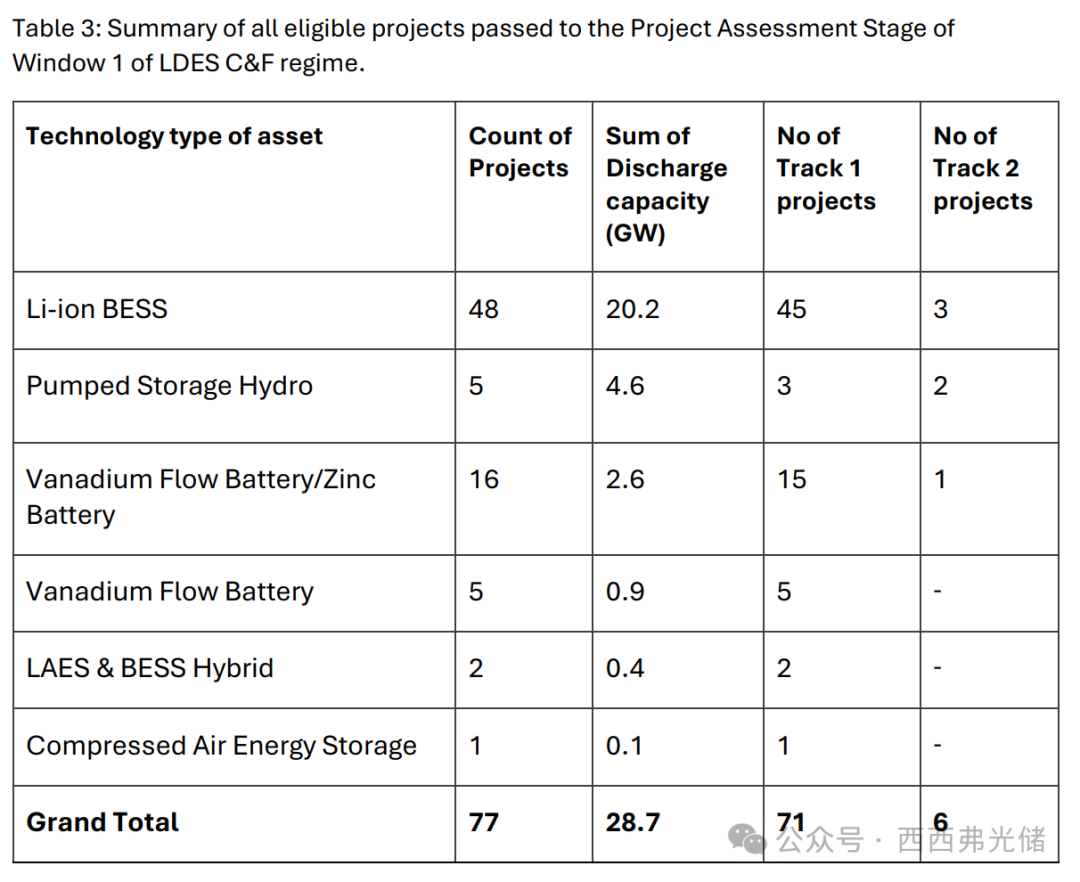 在最初申请的171个长时储能项目(总容量52.6GW)中,最终有77个项目(总容量28.7GW)通过了资格审查,即将面临多标准评估(MCA)。