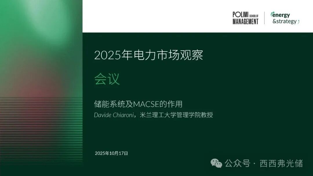 本文总结了米兰理工大学管理学院(POLIMI SCHOOL OF MANAGEMENT)的Davide Chiaroni教授在2025年10月17日举行的“2025年电力市场观察站”会议上的演讲内容。该演讲重点分析了意大利储能系统(特别是电化学储能)的发展现状,以及MACSE(电力储能容量采购机制)在推动中央式储能系统发展中的关键作用。
