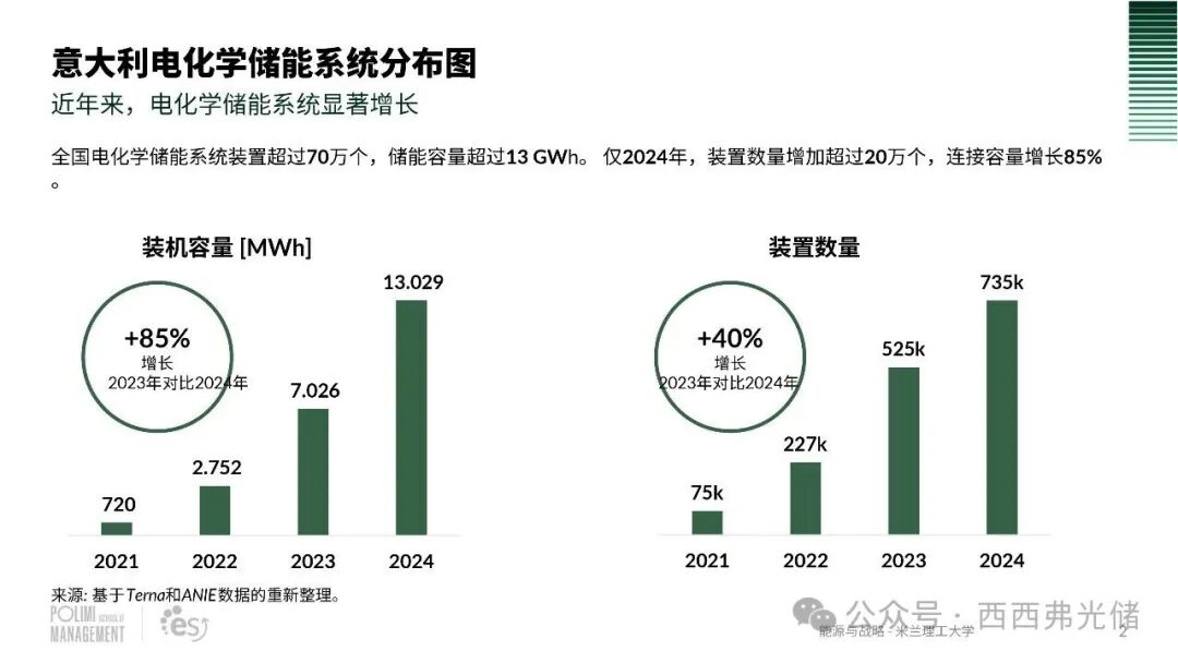 近年来,意大利的电化学储能系统经历了显著增长。截至2024年,全国安装的储能系统已超过70万套,总装机容量超过13 GWh。