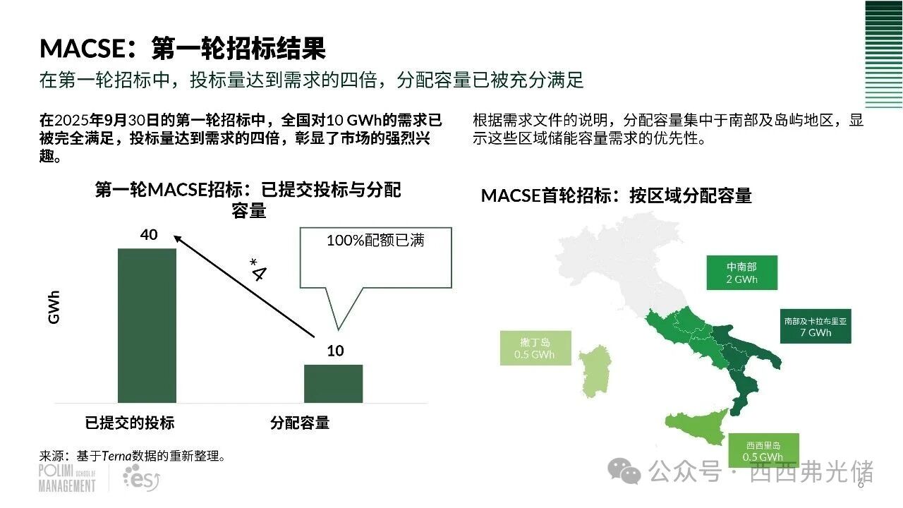 区域分布中标容量主要集中在南部和岛屿地区。其中“南部和卡拉布里亚”占7 GWh,“中南部”占2 GWh,“撒丁岛” 和“西西里岛” 各占0.5 GWh。