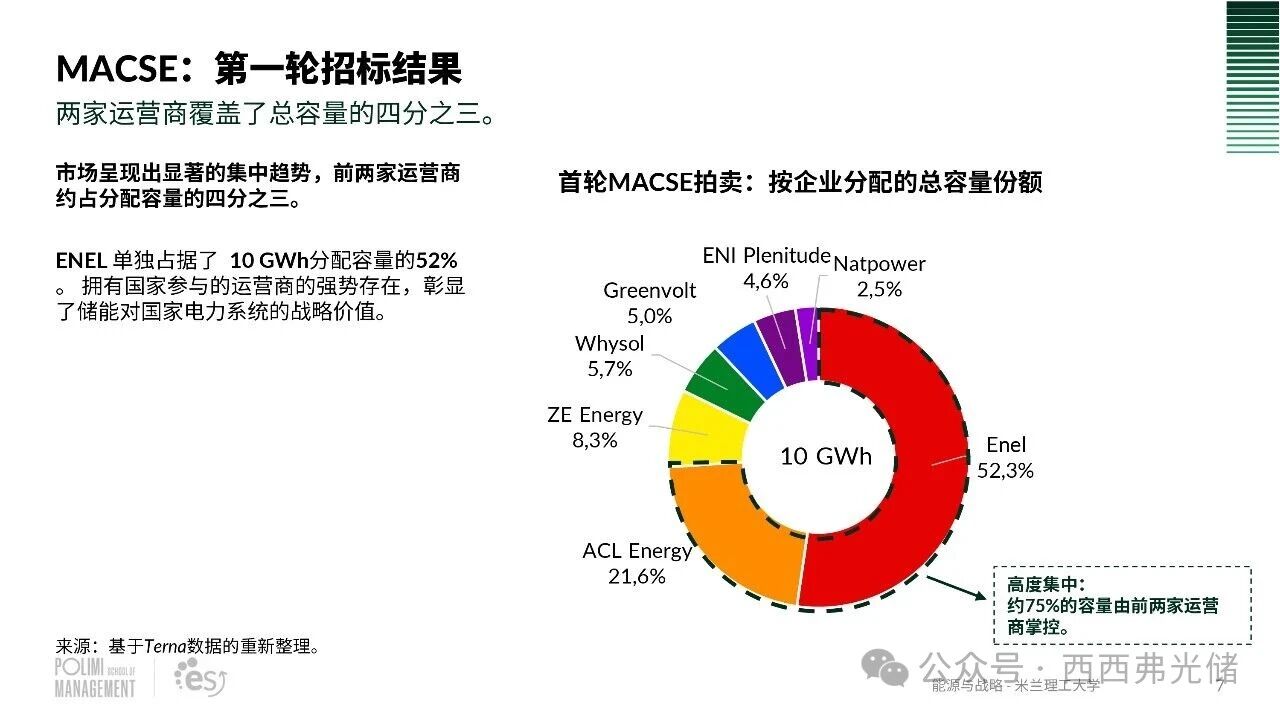 市场集中度(运营商)市场高度集中。排名前两位的运营商获得了约75%的总容量,其中 Enel 占52.3%,ACL Energy 占21.6%。国有控股运营商(指Enel)的强势参与凸显了储能对国家电力系统的战略价值。