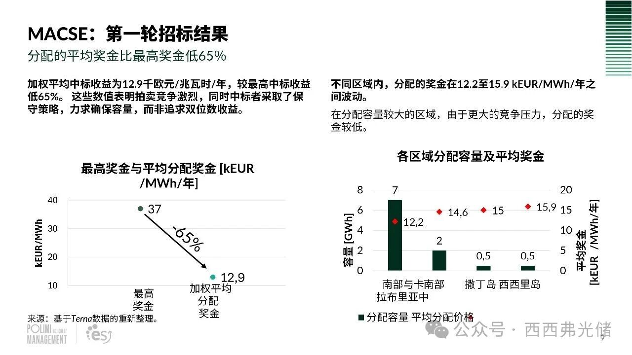 中标价格尽管ARERA(意大利能源网络与环境监管局)设定的最高溢价为37 kEUR/MWh,但激烈的竞争导致最终的加权平均中标溢价仅为12.9 kEUR/MWh/年,比最高限价低65%。