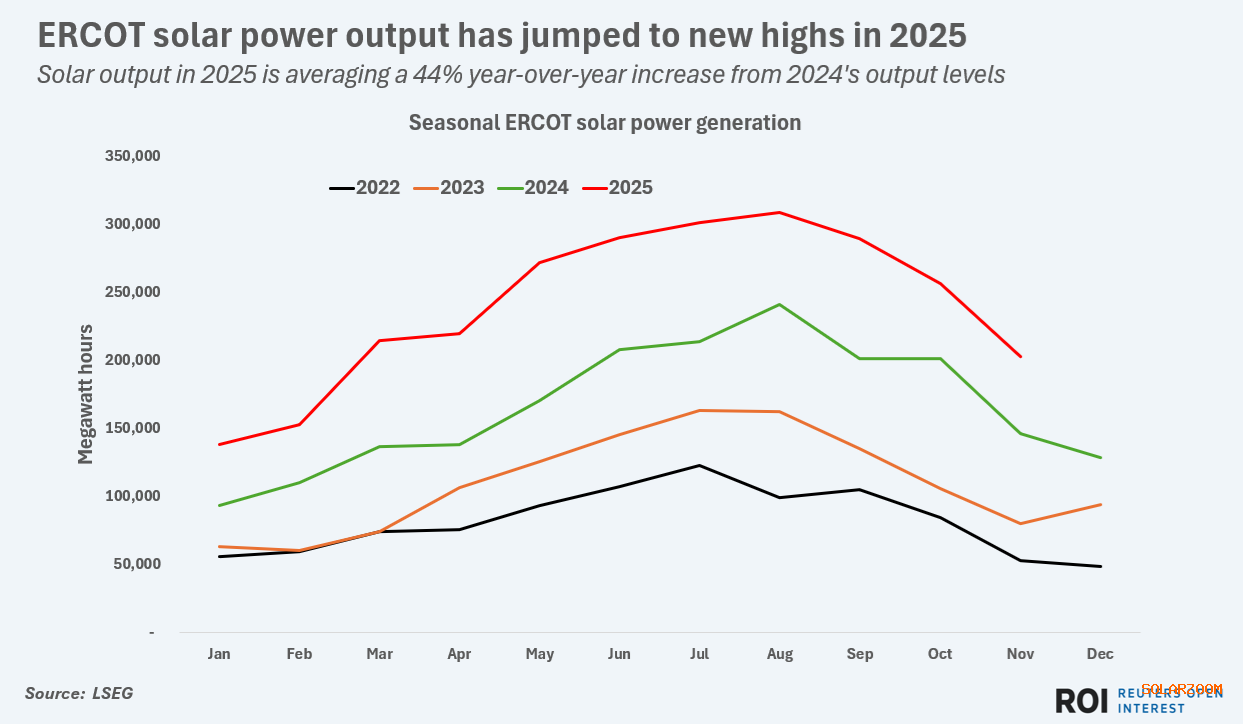 事实上,到2025年至今,ERCOT太阳能产量每月均创下新高,与2024年同期相比,从1月到11月平均增长44%。