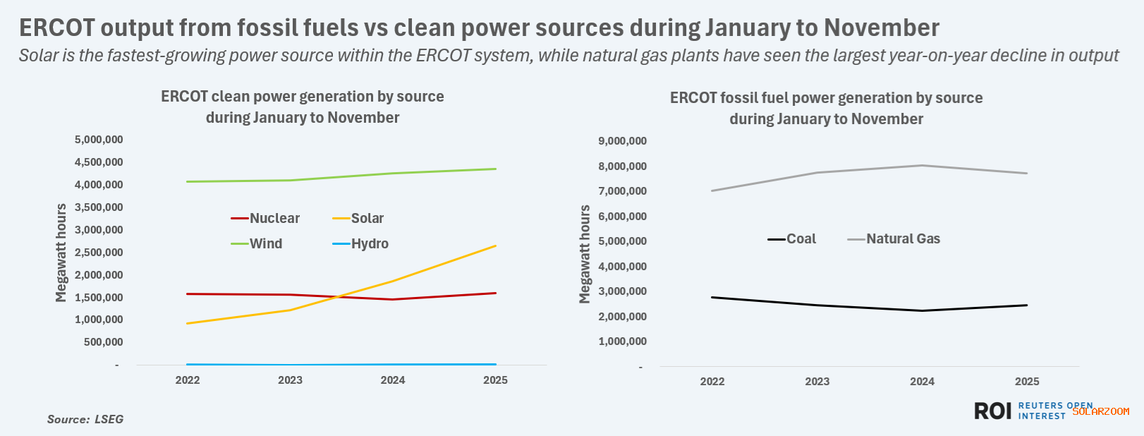 LSEG数据显示,尽管2024年燃煤电厂的ERCOT产量较同期增长了10%,但其太阳能在煤炭发电方面的表现仍显著提升。