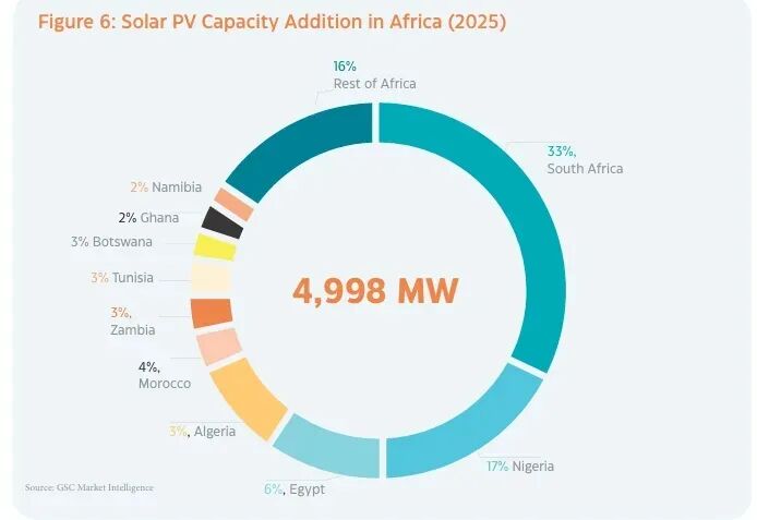 转型提速的核心体现的是光伏装机量的爆发式增长:2025年非洲新增光伏装机量约4.5GW,同比增幅达54%,各地区部署节奏显著加快。其中前十大光伏市场贡献了90%的新增装机量,南非(1.6GW)、尼日利亚(803MW)、埃及(500MW)、阿尔及利亚(400MW)领跑,延续大型成熟市场的强劲活力;与此同时,摩洛哥(204MW)、赞比亚(139MW)等多个中型及新兴市场也实现可观增长,印证非洲光伏市场参与范围持续扩大的趋势。