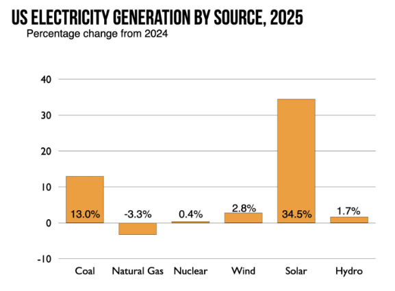 周二,美国能源信息署发布了该国2025年发电情况的全年数据。这有点好消息或坏消息。坏消息是,总体需求明显上升,其中相当一部分通过增加煤炭使用来满足。从好的方面来看,太阳能继续实现了惊人的增长,发电量比一年前增长了35%,并首次超过了水力发电。