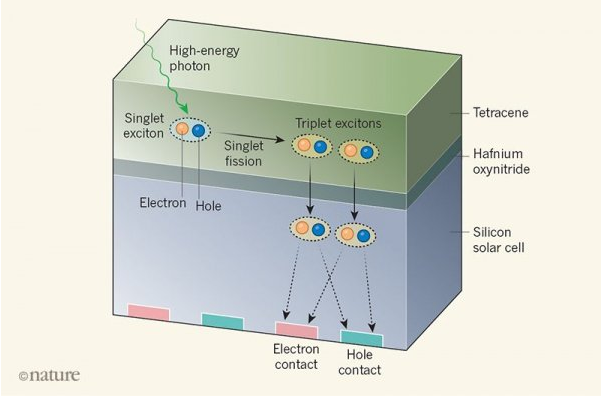 在这种情况下,他们实验了一个叫做单线态激子裂变的过程,这就是光的能量如何分裂成两个独立移动的能量包。“激发态”材料首先吸收光子,形成激子,然后激子迅速经历裂变成两个激发态,每个激发态具有原始状态的一半能量。但是新的问题又产生了,就是如何将两个能量耦合到硅中,而硅是一种非激子的材料。