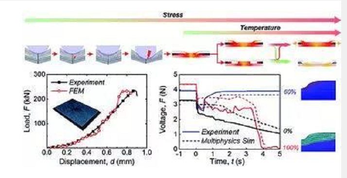 由于内短路过程无法直接观察测量,作者利用有限元和多物理参数模型对内短路过程进行了辅助分析。其中,力模型用于分析内短路前的挤压过程,电池模型和短路模型用于分析内短路过程的电化学行为,热失控模型用于分析热失控行为,以上四大模型和热模型联合使用。