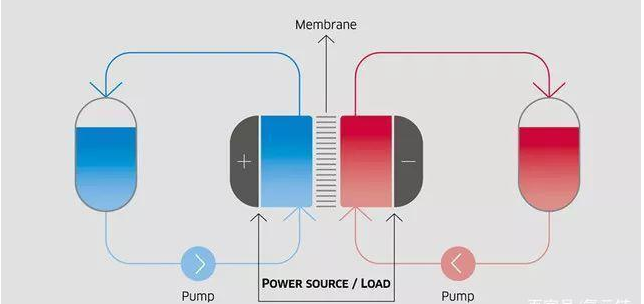 液流储能电池是一种介于传统电池和燃料电池之间的蓄电池,主要是由正负极、隔膜和泵组成,其中正负极被隔膜分开,并分别储存在各自的电解液储罐中。含金属盐类的电解液被泵入液流电池中,电解液里的金属离子在正负极间进行交换,从而产生电流。