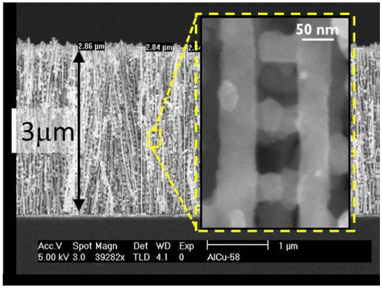 许多工业过程建立在表面发生化学反应的基础上,可用的表面越多,同时发生的反应就越多,这个过程的速度或吞吐量也就越高。这种独特的材料可以通过廉价的阳极氧化和电镀工艺制造,而模具是由铝箔阳极氧化形成的,可以在其中沉积各种各样的材料。将电池电极中的锂转化为锂离子时,纳米网材料可以实现大容量、快速充电,因为它的大表面结合了高孔隙率,具有高储能材料的负载,同时它仍然作为一个纳米薄膜与集电体紧密接触。