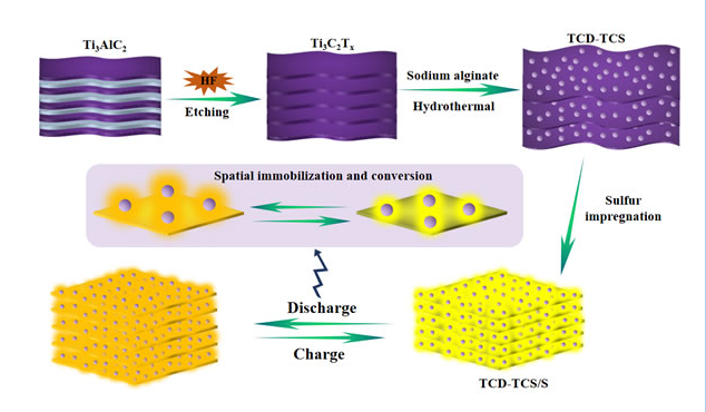 在国家自然科学基金(21601191,21673241, 21471151))和中国科学院战略性先导科技专项(XDB20000000)、福建省自然基金(2018J01030)的资助下,中科院福建物质结构研究所结构化学国家重点实验室研究员王瑞虎课题组采用海藻酸钠诱导的化学键裁剪策略,提出基于MXene的Ti3C2Tx(Tx代表表面官能团)纳米点-散布的Ti3C2Tx纳米片(TCD-TCS),以实现在高硫负载条件下活性物质硫的限域固定和转化。TCD-TCS中丰富的表面极性位点增强了电极的结构完整性,不含碳基材料和导电添加剂使得正极材料具有高振实密度。TCD-TCS/ S电极在1.8mg cm-2的中等载硫量下表现出几乎理论的放电比容量。在13.8mg cm-2的高硫负载下,同步实现超高容量(1957mAh cm-3)和高面积容量(13.7mAh cm-2)。放电过程中硫析出机理研究表明了基于MXene的纳米点和纳米片的集成在Li-S电池中的重要性。上述工作发表于ACS Nano(Ultrafine Ti3C2MXene Nanodots-Interspersed Nanosheet for High-Energy-Density Lithium-Sulfur Batteries, ACS Nano,2019, 13, 3608–3617)。论文的第一作者为助理研究员肖助兵。