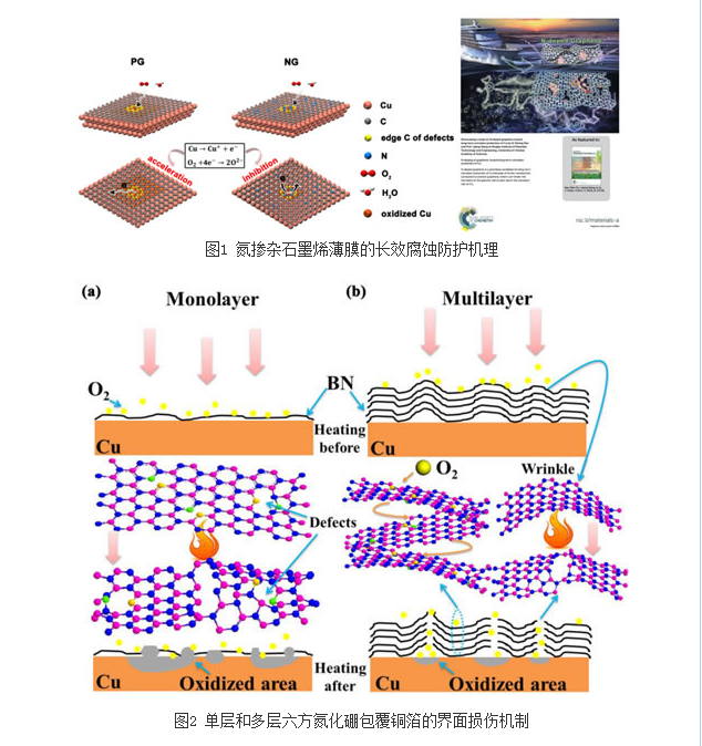 近期,中国科学院宁波材料技术与工程研究所海洋新材料与应用技术重点实验室研究员王立平团队利用CVD技术在多晶铜衬底上成功制备了一系列的氮掺杂石墨烯薄膜,通过调节NH3的气流量获得不同氮浓度的氮掺杂石墨烯薄膜。同时,研究发现氮掺入石墨烯晶格网络中会造成薄膜体系的导电率相比于原始石墨烯下降,在大气长效暴露试验条件下,低导电的氮掺杂石墨烯薄膜可抑制电子在腐蚀界面的传输,降低铜和氮掺杂石墨烯界面处的电化学腐蚀速率,有效延缓腐蚀区域的扩散,表现出更佳的长效腐蚀防护性能(图1),但该方法仍不能根除薄膜在生长过程中形成的结构缺陷,以及所造成的表面不均匀的腐蚀点。相关结果已经发表在Journal of Materials Chemistry A(2018, 6, 24136-24148)上,并作为期刊的Inside back cover被亮点报道。