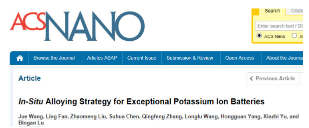 近日,物电院与微电子科学学院博士后王珏博士在钾离子电池研究上获得重要进展,为钾离子电池合金化负极材料在充放电过程中的不稳定提供了一种新的解决思路——原位合金化策略。相关成果以题为“In-Situ Alloying Strategy for Exceptional Potassium Ion Batteries”发表于ACS Nano(影响因子13.709)。
