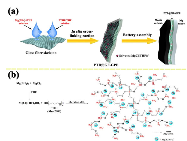 基于以上研究背景,依托中国科学院青岛生物能源与过程研究所建设的青岛储能产业技术研究院通过硼氢化镁与聚四氢呋喃端羟基的原位交联反应,在玻璃纤维骨架上构建了一种能够可逆地沉积溶解镁的凝胶聚合物电解质体系。该凝胶电解质表现出高的镁离子迁移数(0.73)和高的室温离子电导率(4.76×10-4 S/cm)。而装配该凝胶电解质体系的Mo6S8/Mg电池不仅能在宽温区(-20-60℃)内正常工作,而且展现出优异的安全性能。这种原位交联的方法为镁电池聚合物电解质的进一步开发提供了一种十分有应用潜力的策略。相关成果发表在《先进材料》(Advanced Materials)上,论文第一作者为青岛能源所博士生杜奥冰。
